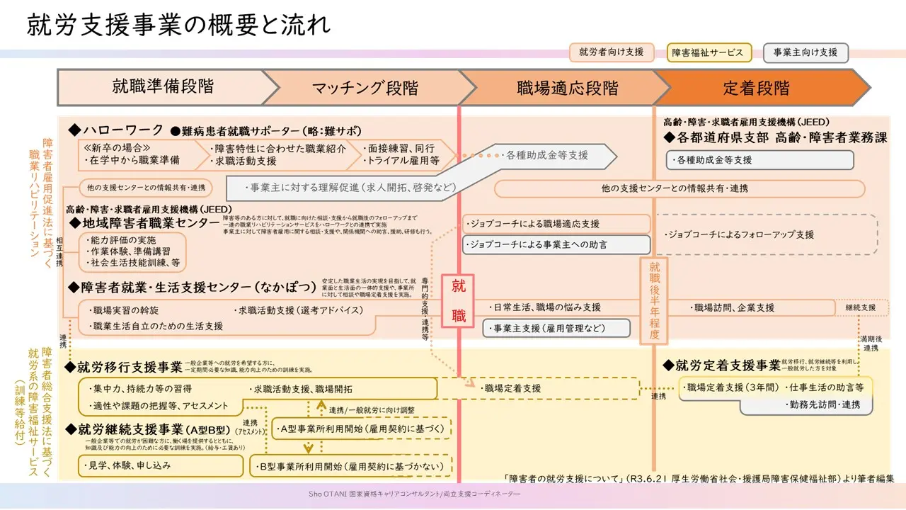 特徴は、①就職準備段階、②マッチング段階について、職業リハビリテーションとしての支援がハローワークを中心に整えられている点です。
