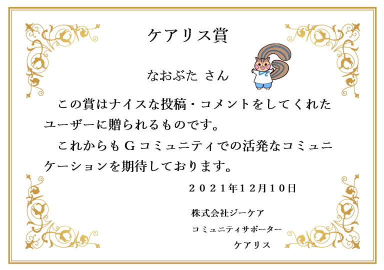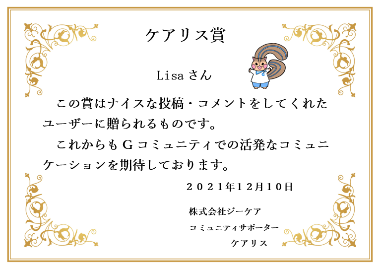 6月から表彰を始めました、ケアリス賞ですが、今月の受賞者は、なおぶたさん、Lisaさんの2名に決定しました!