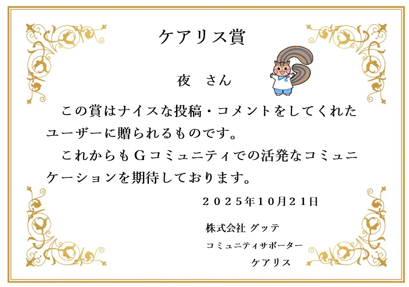 「ナイスな投稿やコメントをしてくれたユーザーを表彰する」ケアリス賞ですが、